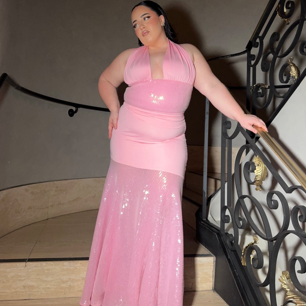 SIERRA DARIEN (pink) Pleated Halter Midi Dress With Cascading Ruffle