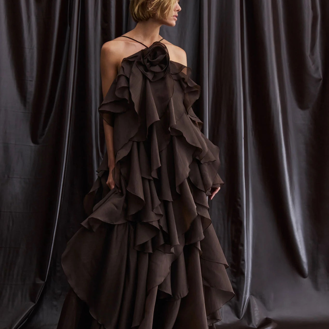 SIERRA DARIEN (purple) Pleated Halter Midi Dress With Cascading Ruffle
