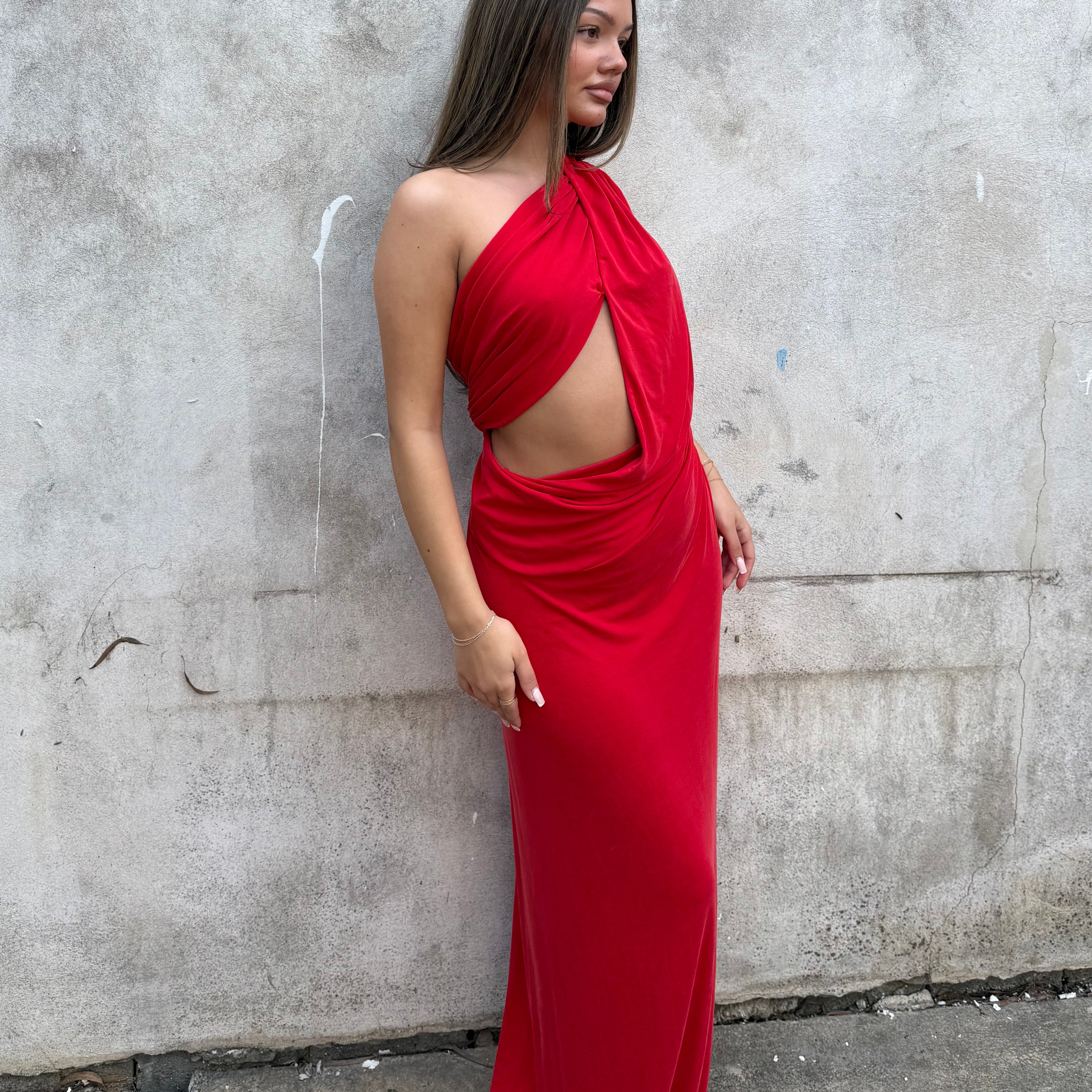 MISHA (wine/burgundy) Sisal one shoulder mesh maxi