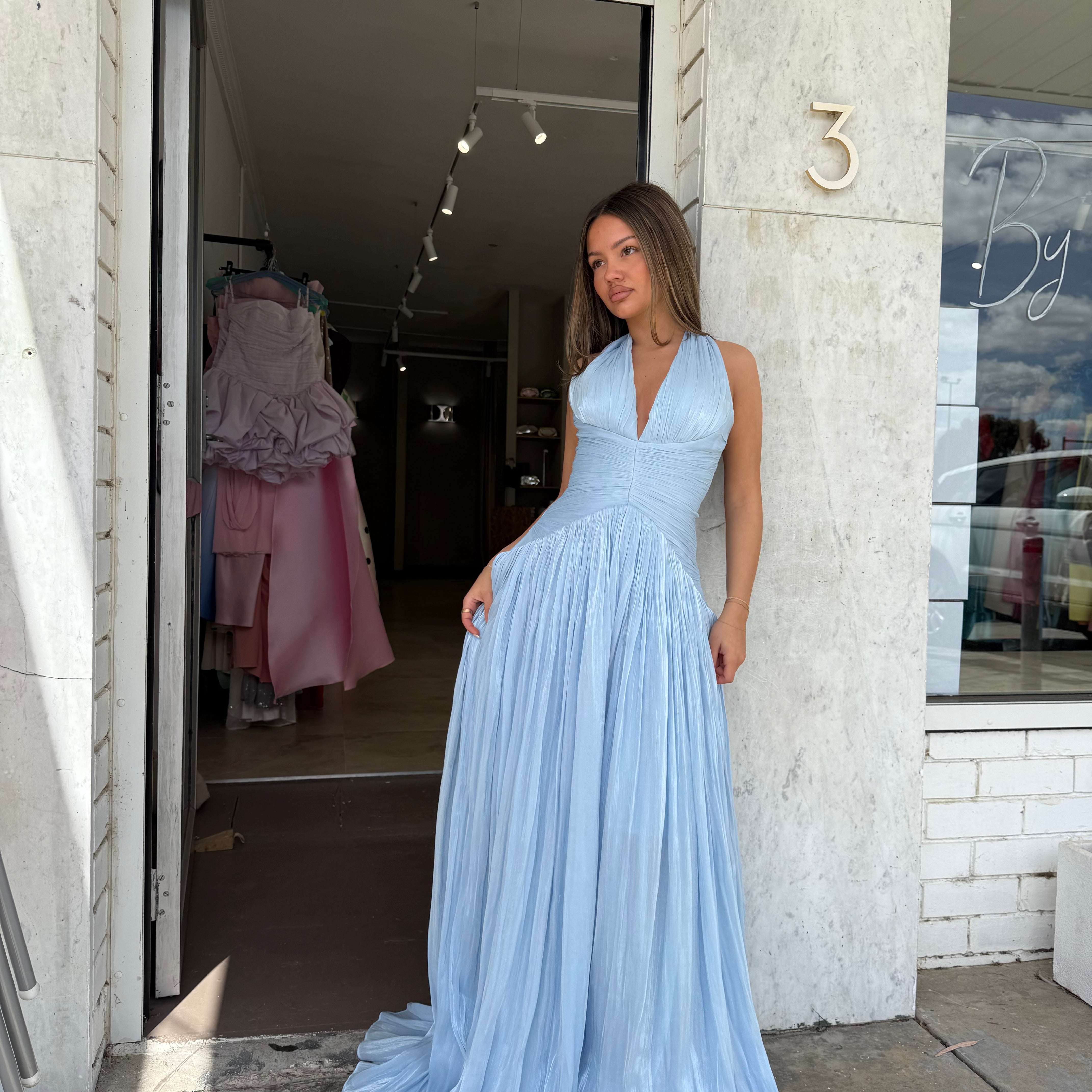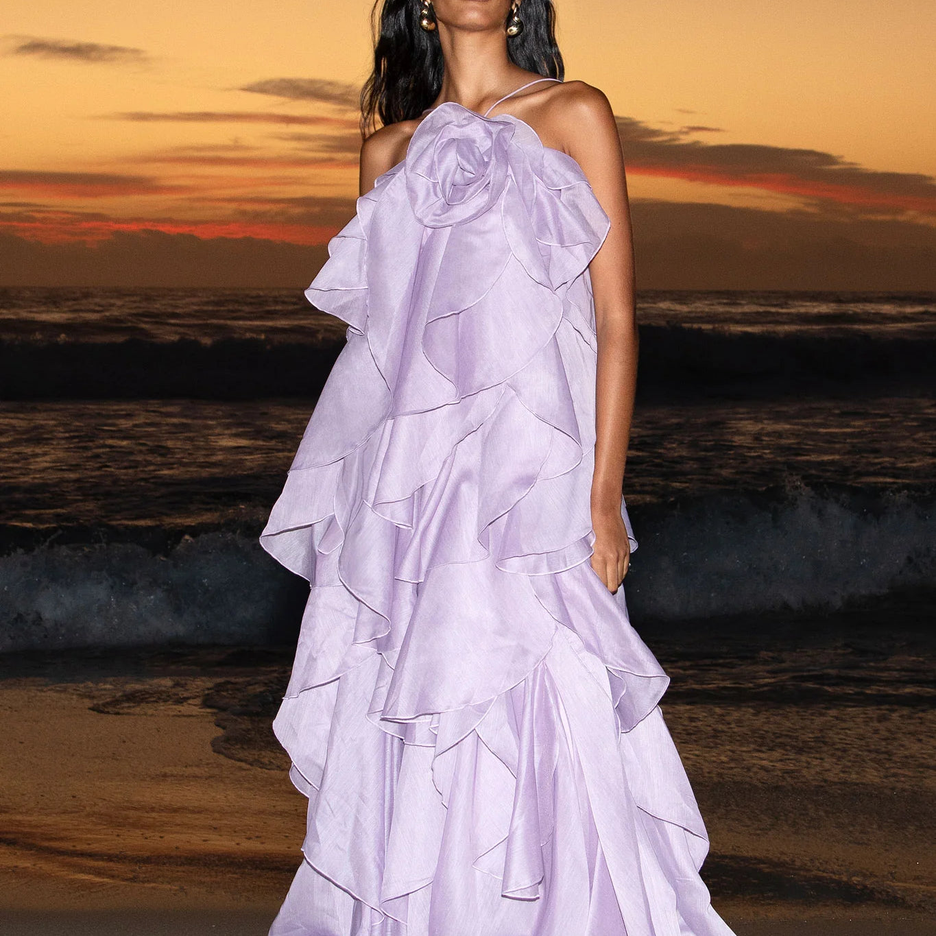 SIERRA DARIEN (purple) Pleated Halter Midi Dress With Cascading Ruffle