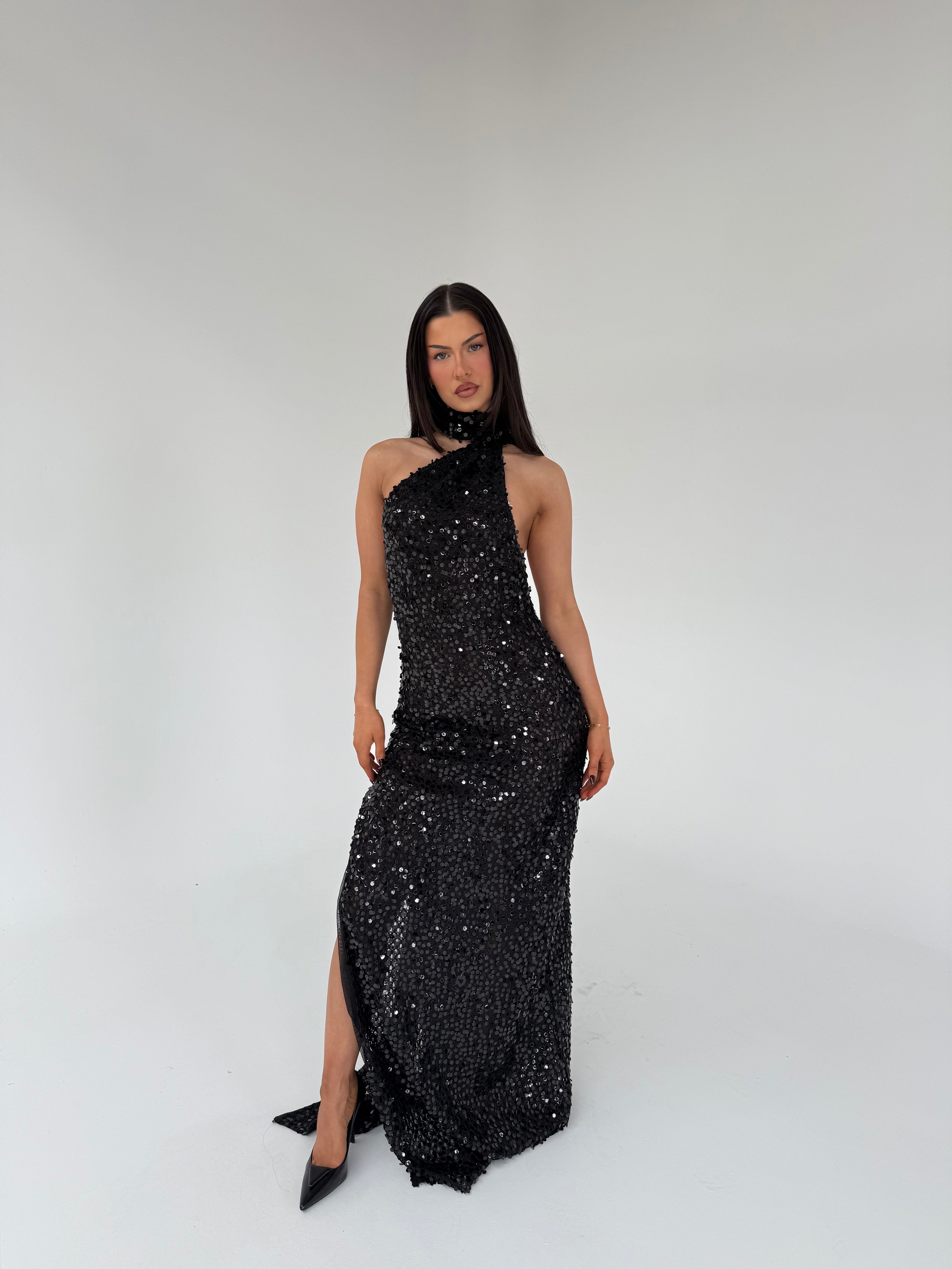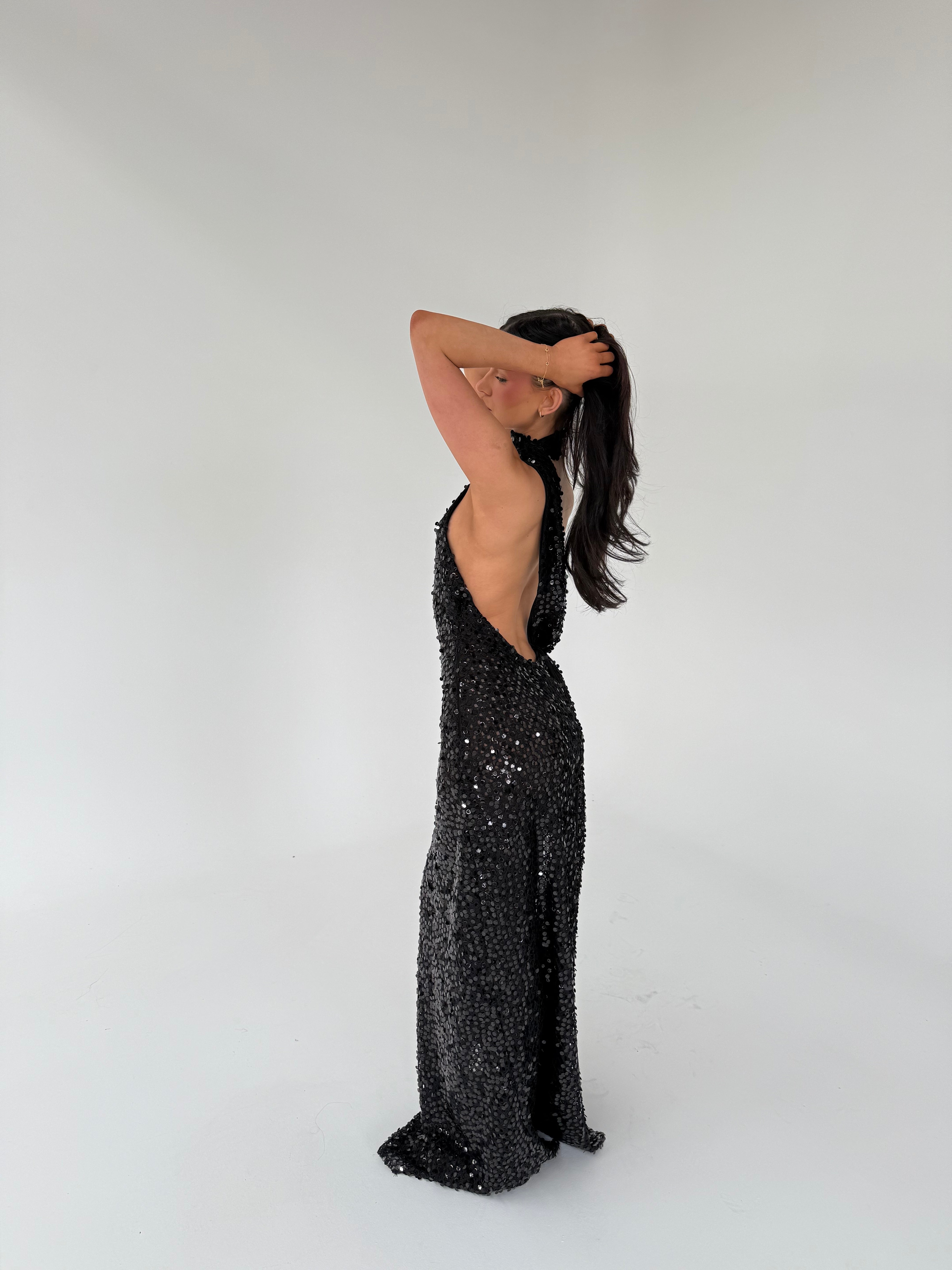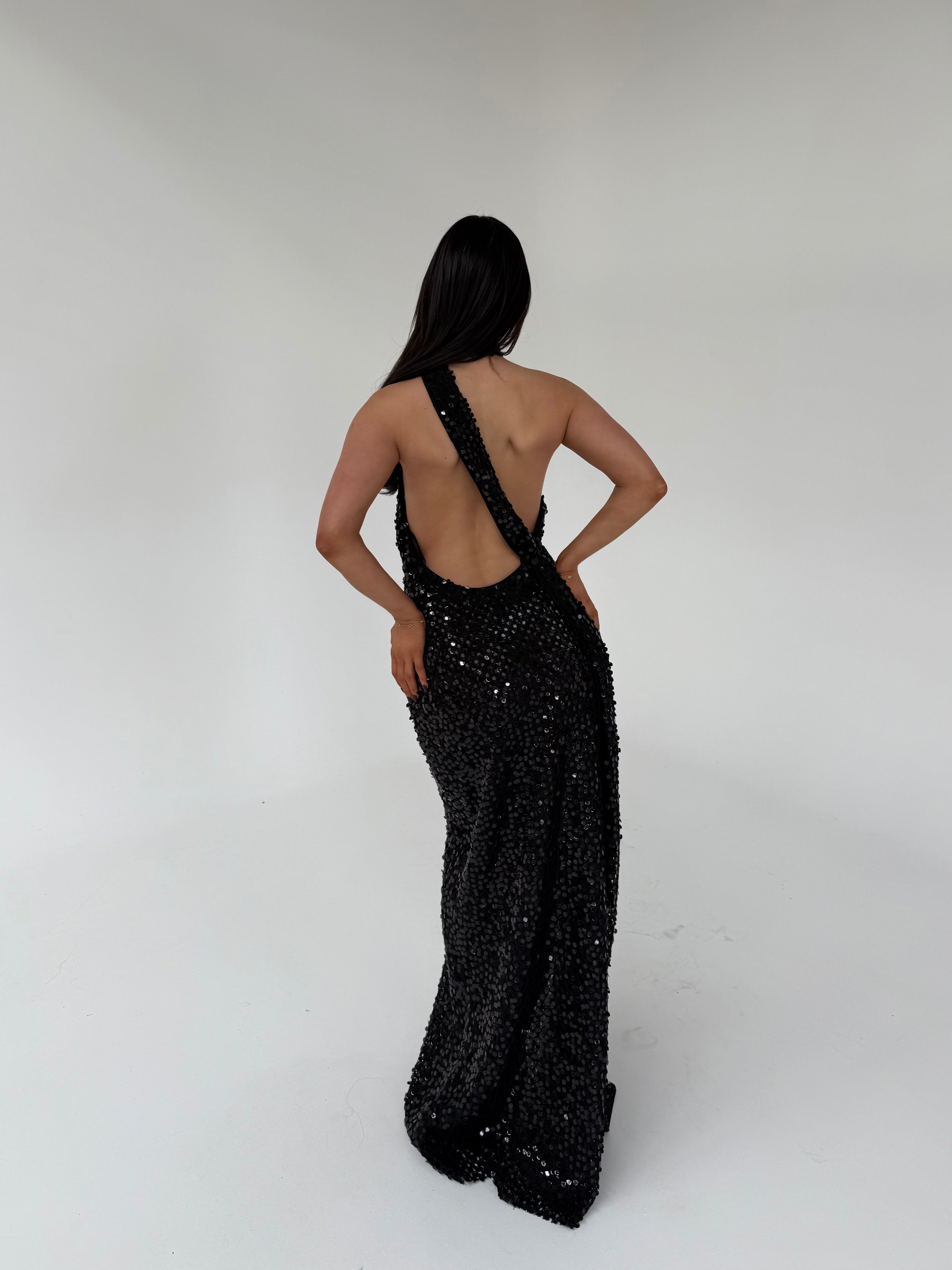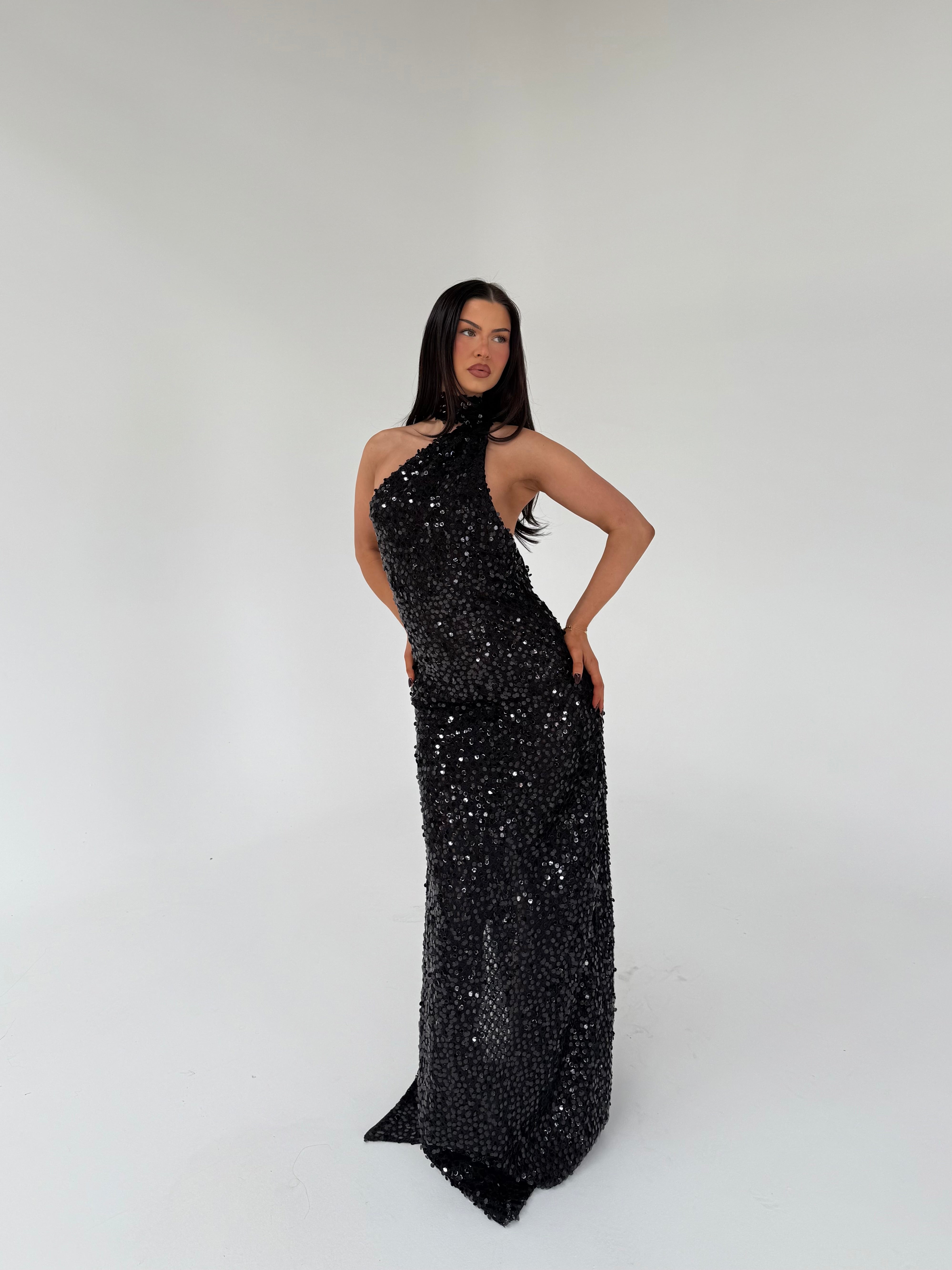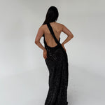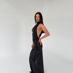 MISHA (black/sequin) Nicolette crotchet halter gown